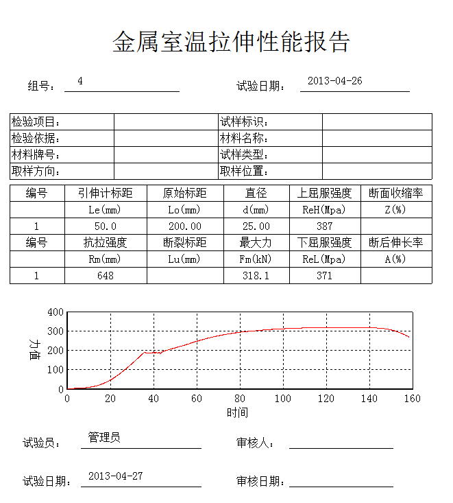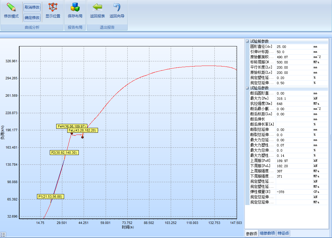 (5)數(shù)據(jù)處理分析界面:可根據(jù)用戶要求自動(dòng)求取,ReH 、ReL、Fm、Rp0.2、Rt0.5、Rm、E等