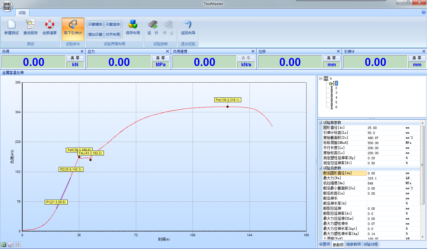 (4)數(shù)據(jù)處理分析界面:可根據(jù)用戶要求自動(dòng)求取,ReH 、ReL、Fm、Rp0.2、Rt0.5、Rm、E等